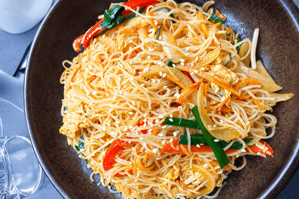 Stir fry flat rice noodle with shallots, sprouts and chinese broccoli