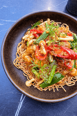 Wok tossed Barramundi and shimeji mushrooms, crispy egg noodles in housemaid XO sauce